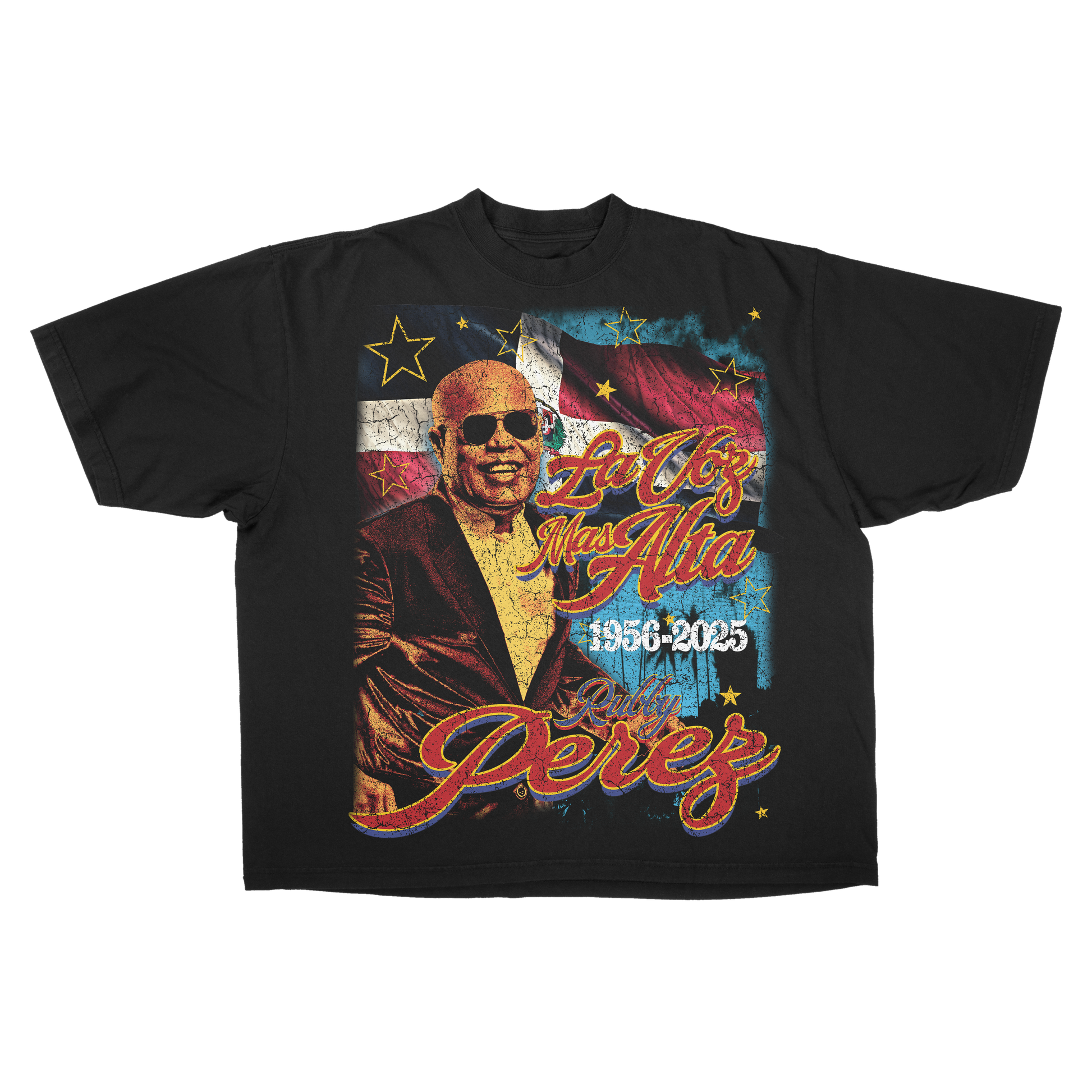 A powerful portrait of Rubby Pérez radiates from the chest, backed by the Dominican flag and surrounded by golden stars. The phrase “La Voz Más Alta” pays homage to his unmistakable voice, with the years 1956–2025 marking the span of his remarkable journey.
